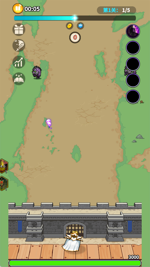 1、打开英雄防线游戏进入战场,操控英雄在城墙上迎战小怪。