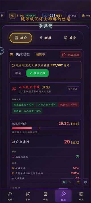 (6):改政体导致税收效率降低怎么办?这个得看你货币盈余量决定,货币盈余足够多的情况下拿他换产出算不上问题,只是最好维持40%以上合法性避免动乱,在实行方面因为你缺这个产品他价格大概率很高,你也会投资这个产业增加岗位,再加上市民往高收入岗位去,这个阶级自然会有人有钱,影响力应该不会太低。