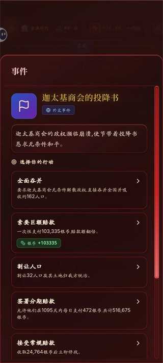 10、打仗过程中,其他国会来求和,全部拒绝(除非对面兵力高,再打下去打不过)。等战争分到350,出现吞并选项之后,就可以答应了。别选吞并!!!我们的目的是发战争财,把别的国家当血包养,一定要选分期付款。