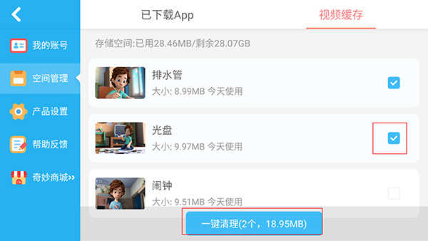 3、找到需要清理的视频文件,勾选右侧的小方框按钮,最后点击下方的“一键清理”按钮即可。