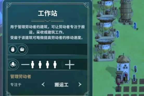 工作站可以指派村民专注于某种类型的工作并提供加成,分为杂工、搬运工、建筑工、收割工四类。