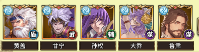 黄盖能为我方武将提高保护,孙权用来提高我方的生存能力,再由鲁肃的冰冻使对手无法行动,最后由大乔与甘宁担任主力输出。