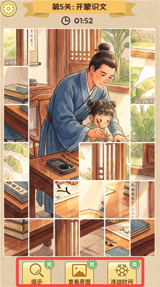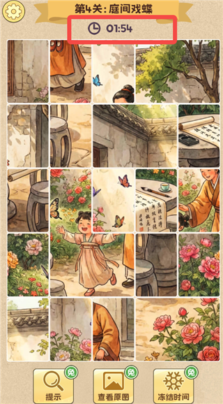 4、下方还为大家提供了提示、查看原图、冻结时间等道具,可帮助大家快速完成拼图。