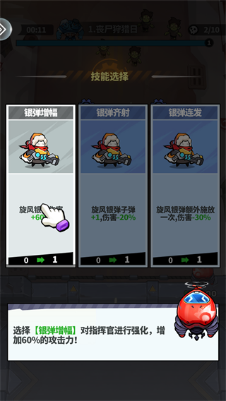 前期优先选择“银弹增幅”技能,可直接提升60%攻击力,大幅增强输出能力,快速清理小怪,避免被敌人包围。