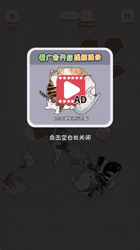 每只兔子都分成了两块,点击旋转不同的部分拼在一起组成完整的猫猫,成功拼成的兔子会消失。