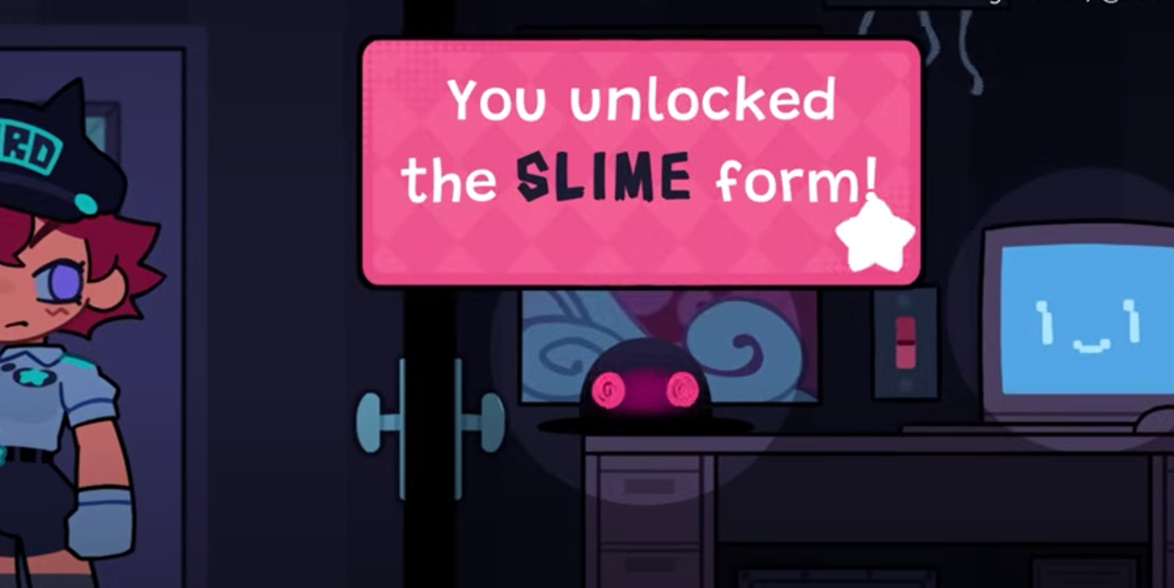 5、变对讲机吸引保安→保安进入初始房间后,立刻切触手史莱姆,再钻管道回左边房间