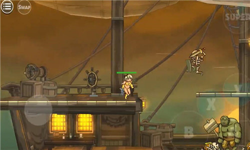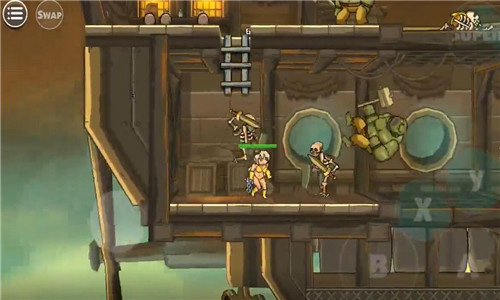 之后选择完人物我们就要开始闯关生涯了。采用虚拟遥杆的操作,左侧是上下左右的控制键子,因为虚拟所以没有显示哦,小编玩着玩着之后发现,虚拟摇杆真的蛮神奇,而且可以用盾牌挡住自己进行下蹲,之后的关卡可离不开这个操作噢,抵挡各种不明飞行物的最好方式就是蹲下。这个A则是攻击键子,B则是跳跃键子。还有大招的释放,当然是有CD的。用这几个按键互相结合的操作打怪物简直不能再舒适了!开始的时候会左右同时出怪物,为了避免掉血,就是要看操作之间的配合情况了。可以跳跃到一方进行攻击,也可以迅速打击左侧之后再攻击右侧,速度是一切的前提。