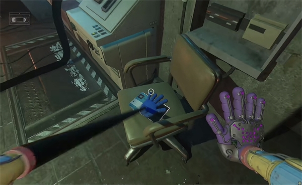 3、进入之后会看到桌子上有一个录像带,按键拿起,再按E键放入一旁的录像机。等到电视上的录像播放完毕,旁边的玻璃门会打开,拿走里面的抓抓背包。
