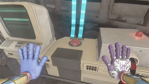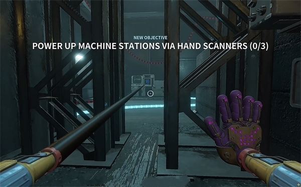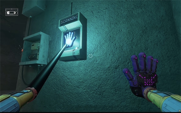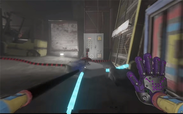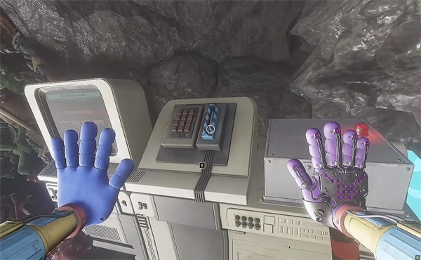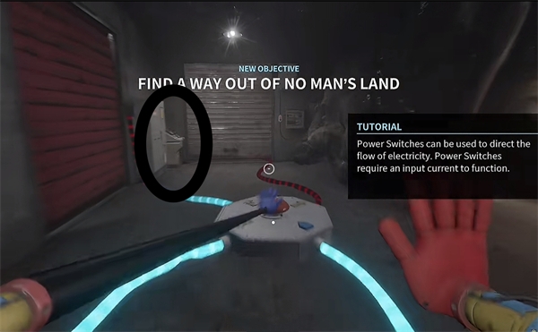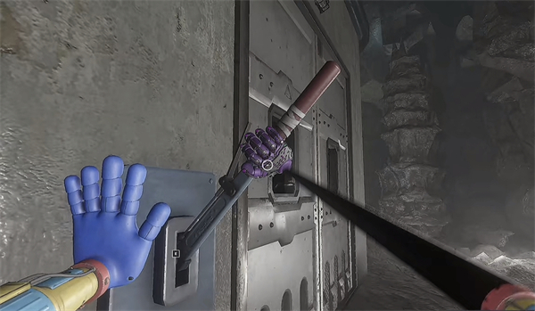 6、开门之后走里面还会有一个开关给他拉下来,往前走进去用蓝色手臂互动一下前面的开关,这里要触发三个开关才能有电流打通出口