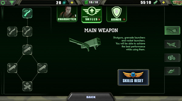 3、在“skills”中可以提升角色对于各项武器的使用能力。