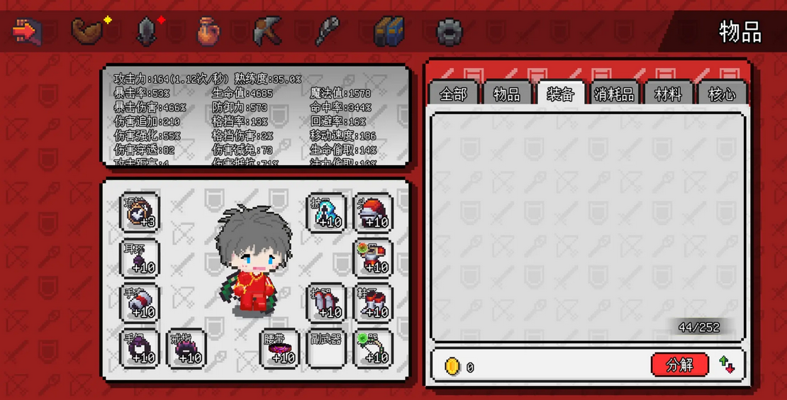 9、点击界面左上角的“锄头”图标进入对应界面后,白底显示的装备材料完备,可直接进行合成操作;黑底显示的装备则需要先收集部分缺失的材料才能合成。