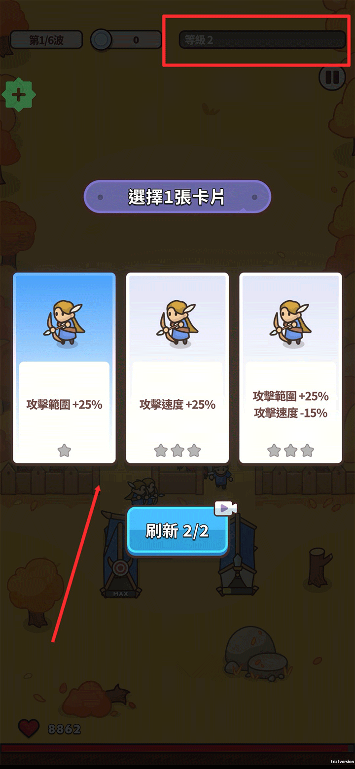 4、战斗开始后,建筑会自动派出士兵与敌人交锋。每当右上角的战斗等级提升时,玩家可获得一次抽取卡片的机会,卡片能带来随机增益或特殊效果。