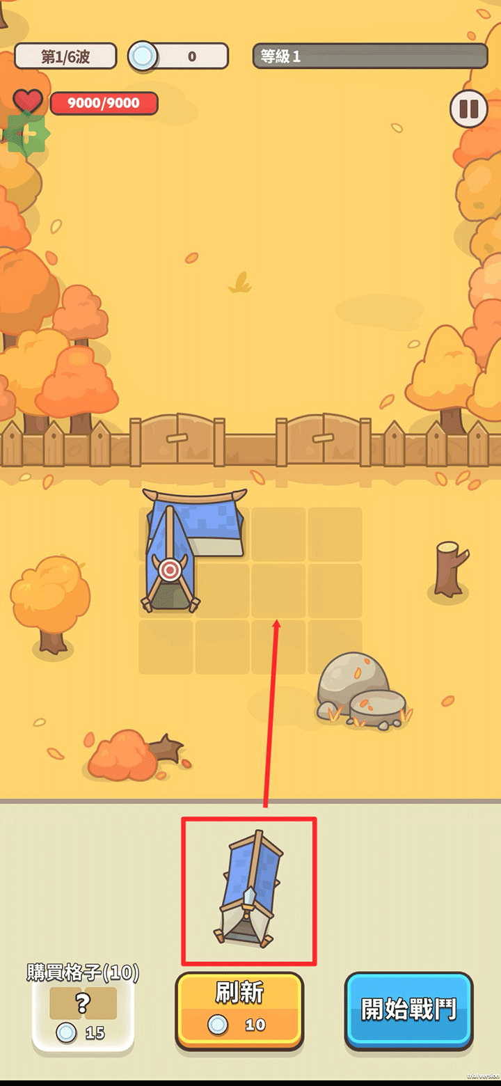 3、在战斗准备阶段,玩家需要将下方的建筑拖放到指定格子中,完成布置后再点击“开始战斗”。
