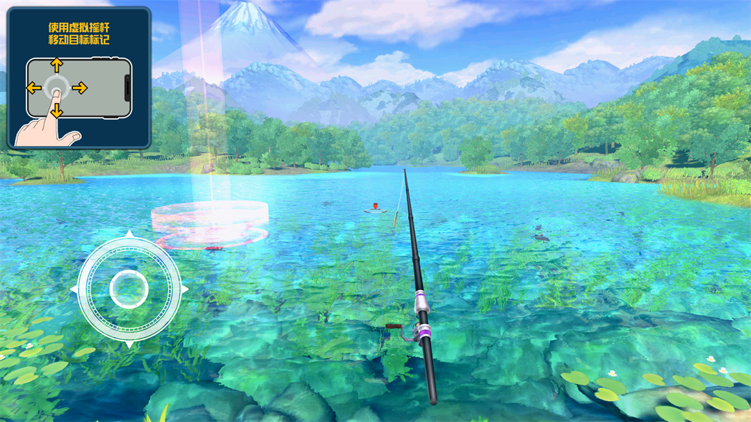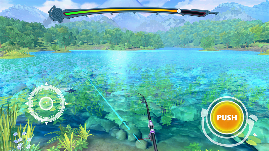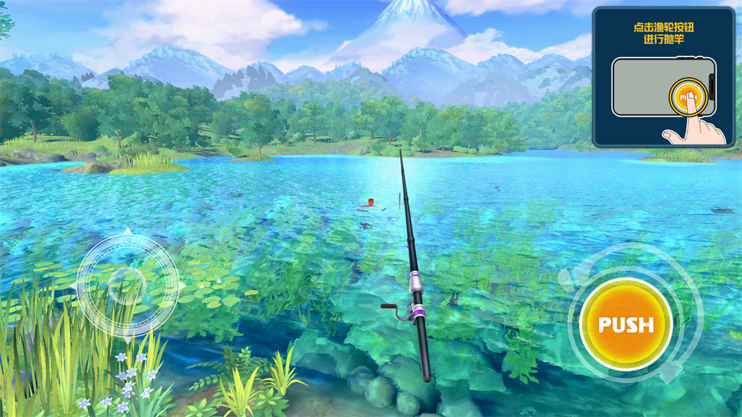 进入钓鱼场景后,通过左侧操控区域调整鱼漂位置,确认位置后点击右侧的push 按钮,可完成抛竿、投放鱼饵的动作。