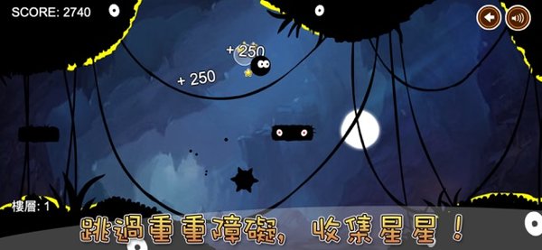 1、点击左右键来操控小黑球的方向,在这个神秘的原始森林完成各种惊险刺激的跑酷任务。