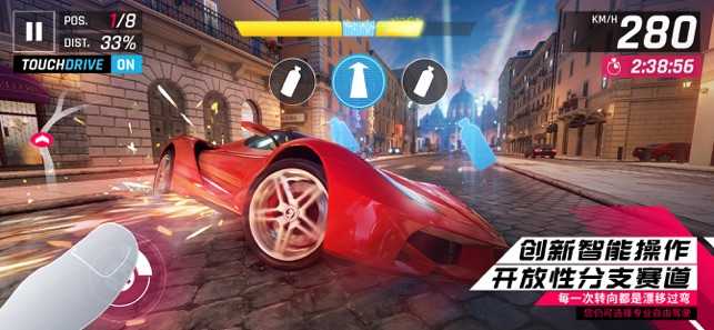 智能操作模式:算是中和了大师和倾斜两种模式,没必要移出什么的,这个模式本来就是给一些没玩过这类型的游戏或是某飞车转过来的玩家熟悉道路玩的,左右滑动来控制方向,点击使用氮气和漂移。