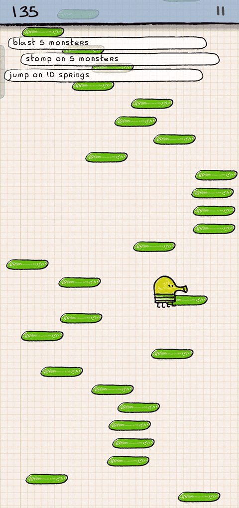 doodle jump游戏的不同形式和不同元素构成了多种主题,不一样的游戏主题让玩家可以在游戏里体验到不一样的游戏风格和创意,游戏可以随时打开,适合在片段时间里的休闲,玩家可以在等人或者等车的时候打开游戏玩耍,可以很快的打发时间,快来游戏里一起弹跳吧。